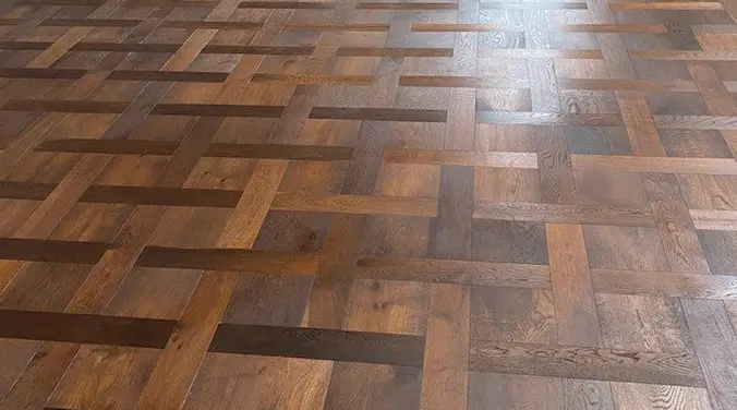 Want to add some vintage charm? Basketweave is your answer. This pattern looks like a woven basket, with rectangular planks forming square units. It’s eye-catching and works well in smaller spaces or areas where you want the flooring to stand out.
